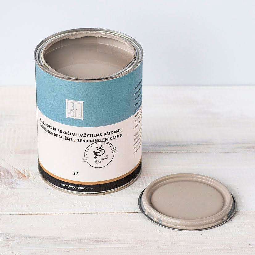 Švelni pilkšvai smėlinė, neutrali, elegantiška ir universali spalva. Puikiai dera su visomis likusiomis Foxy paint spalvomis. Suteikite seniems baldams naują gyvybę